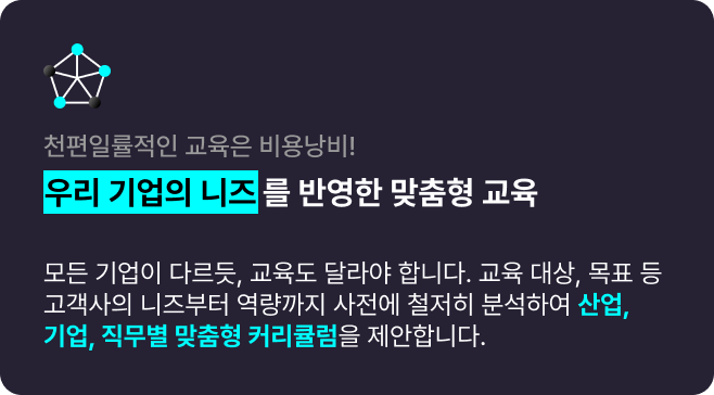 모든 기업이 다르듯, 교육도 달라야 합니다.교육 대상, 목표 등 고객사의 니즈부터 역량까지 사전에 철저히