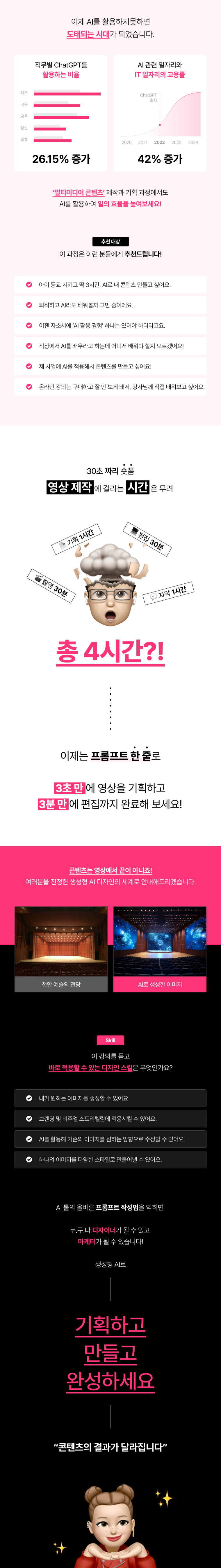 | 생성형 AI 콘텐츠 제작 실전 프로젝트 | - 생성형 AI를 활용한 콘텐츠를 기획, 제작 및 최적화하며, 개인 또는 기업 브랜드에서 활용할 수 있도록 전략적 적용 방법 학습 |