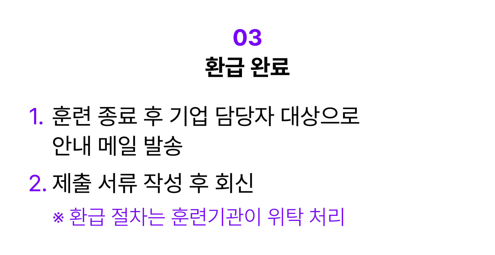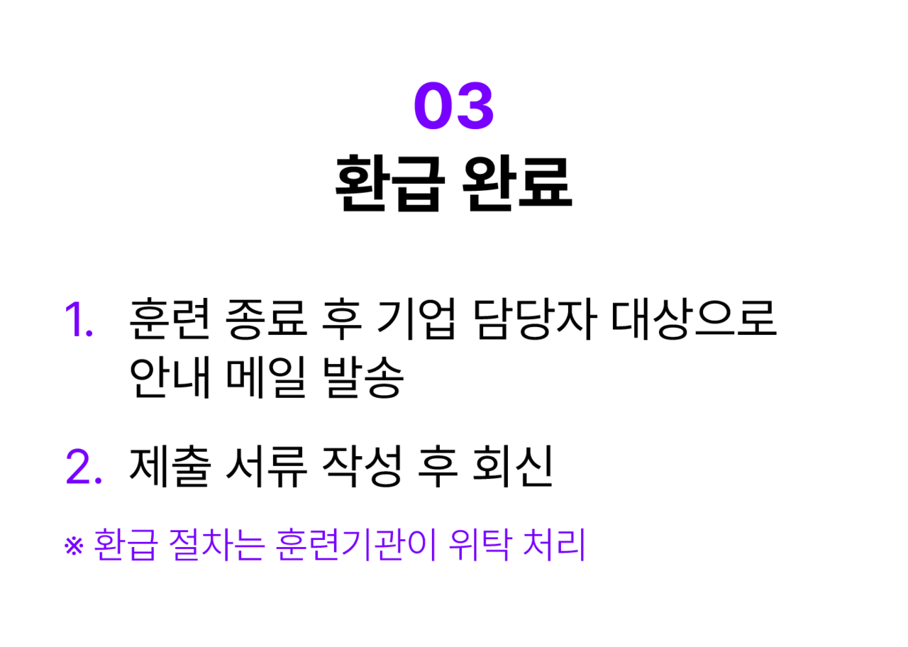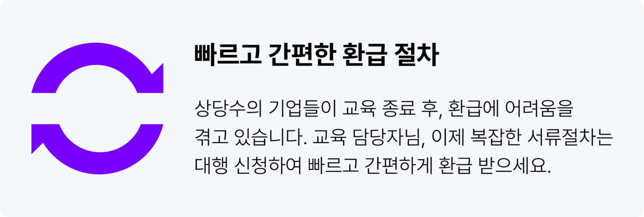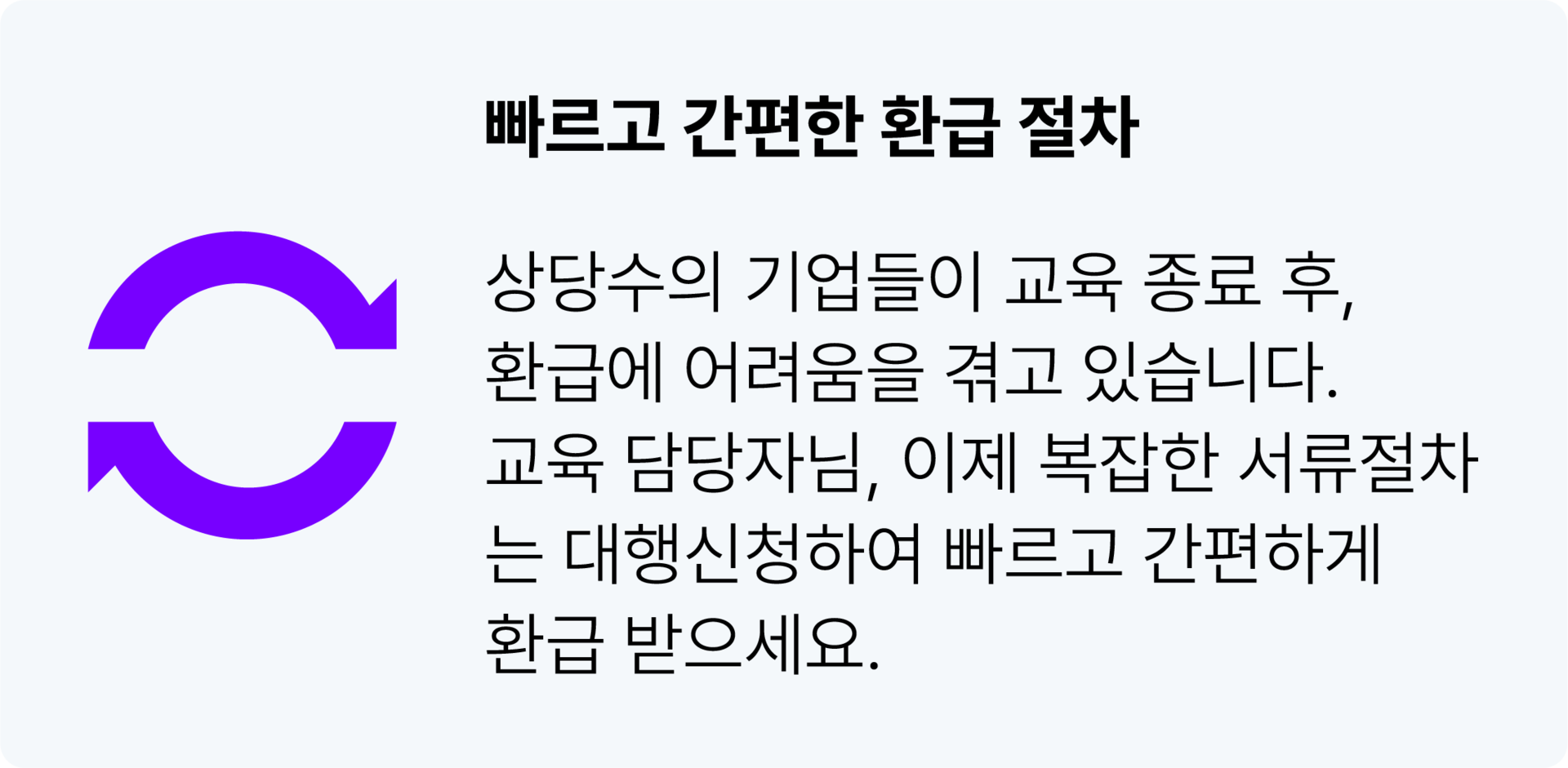 우선지원대상 재직근로자가 원하는 훈련과정에 참여할 수 있도록 기업이 훈련비를 지원하면, 사업주가 부담한 비용의 90~95%를 환급해주는 정부지원 사업입니다.