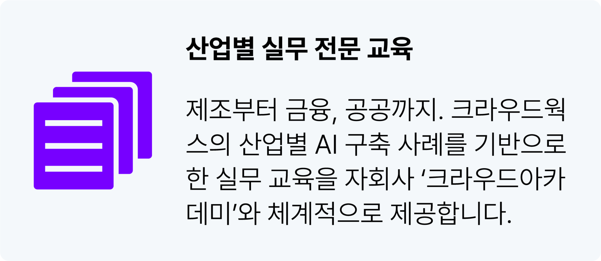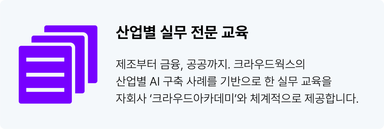크라우드웍스에서는 AI 기술을 활용하고 현장에서 즉시 활용 가능한 실습 중심의 AI융합형 교육을 실시합니다.